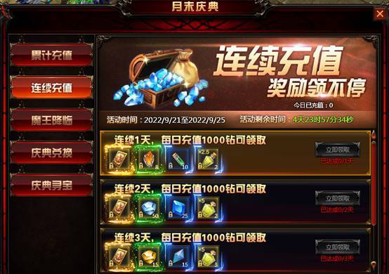 活动内容:活动时间内,玩家每日充值达到1000钻,即可获得丰厚奖励!