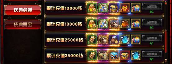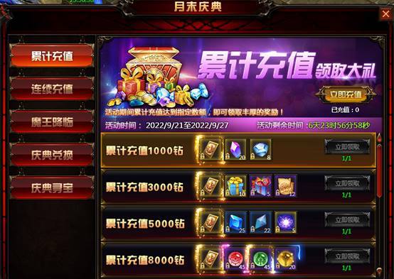 活动内容:玩家在活动时间内,累计充值达到一定钻石即可获得丰厚礼品,超值奖励等你来拿!