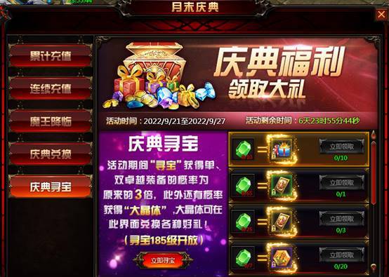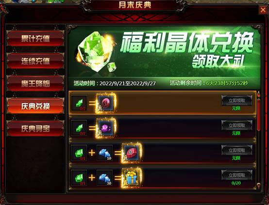 活动内容:玩家在日常挂机击杀小怪可获得小晶体,击杀野外BOSS、黄金BOSS、参与魔王降临活动可获得中晶体,使用不同晶体及钻石比例可兑换游戏中稀有道具,详情请根据游戏中活动兑换页面为准。