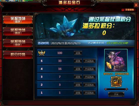 活动内容:活动期间,玩家需要根据采掘区域品质的不同来使用探宝药水或钻石进行开采,开采成功后可以直接获得积分也可以继续向上层开采,开采的层数越高失败的几率越大,失败后无法获得当前层数的积分