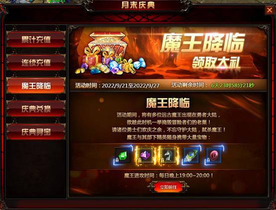 活动内容:活动时间内,每天晚上19:00~20:00勇者大陆会刷新魔王BOSS,击杀BOSS后可获得大量稀有道具奖励。